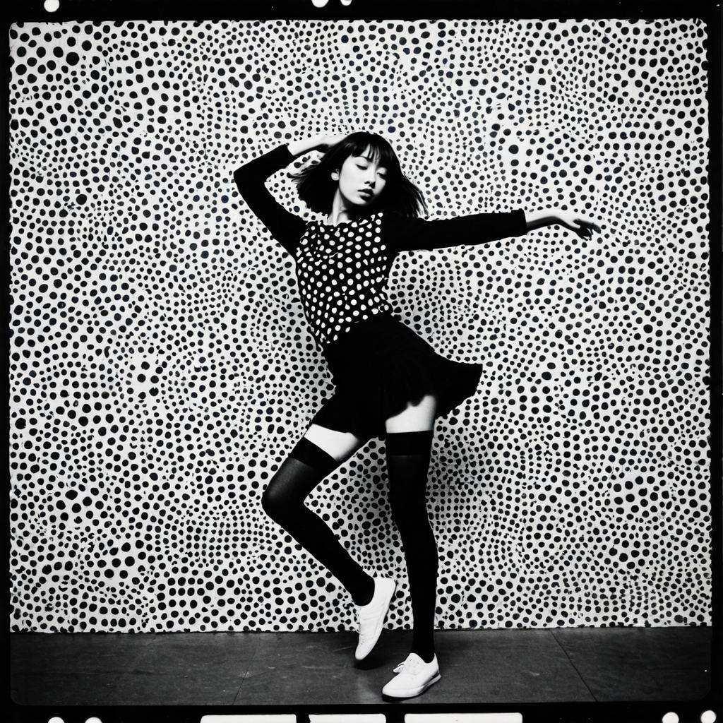 Black and white portrait of an energetic young Asian female dancer in mid-motion. She is wearing a polka dot top, black skirt, thigh-high stockings, and white shoes. The background features a wall covered in an intricate polka dot pattern inspired by Yayoi Kusama, creating a striking neo-pop and grunge chic aesthetic. The image has a vintage feel reminiscent of Provia film photography with influences from Henri Matisse and Eiichiro Oda.