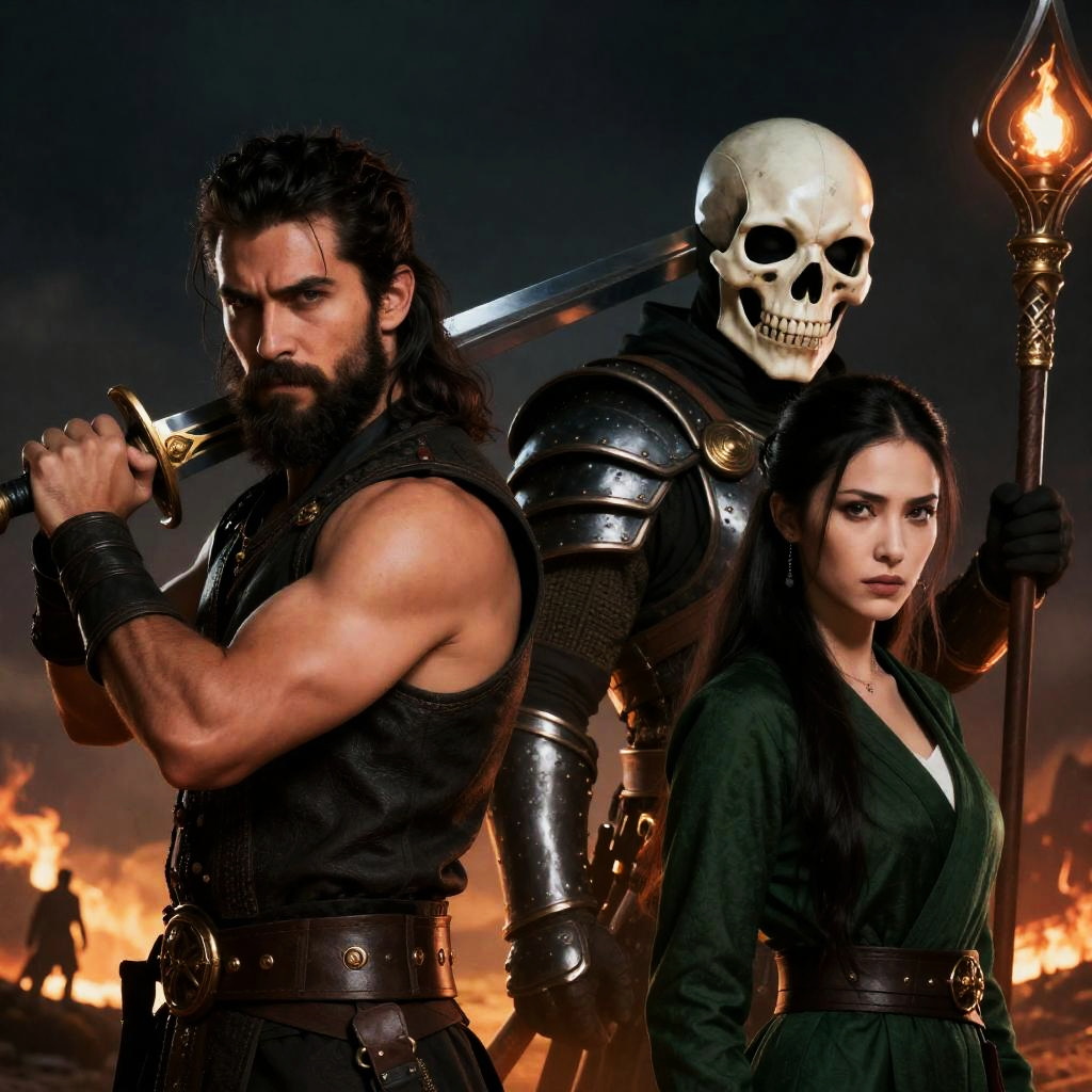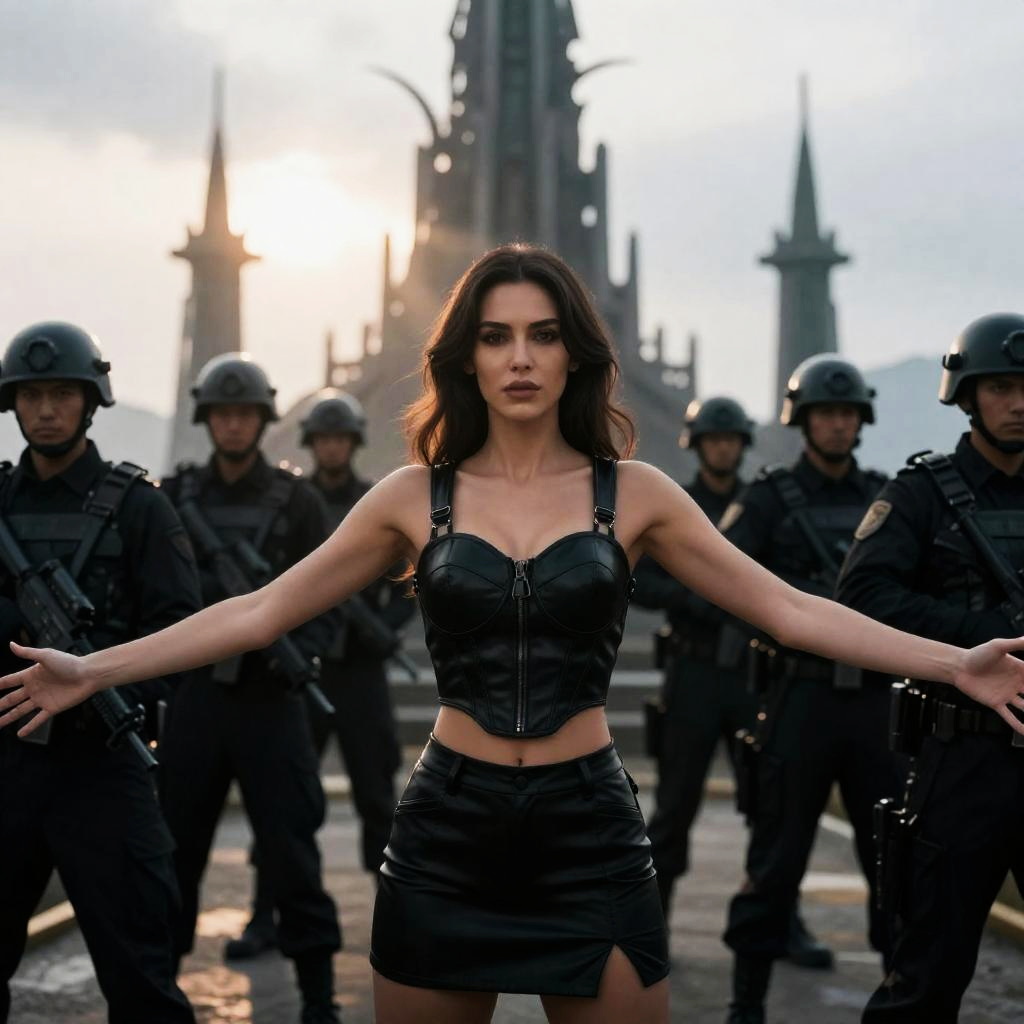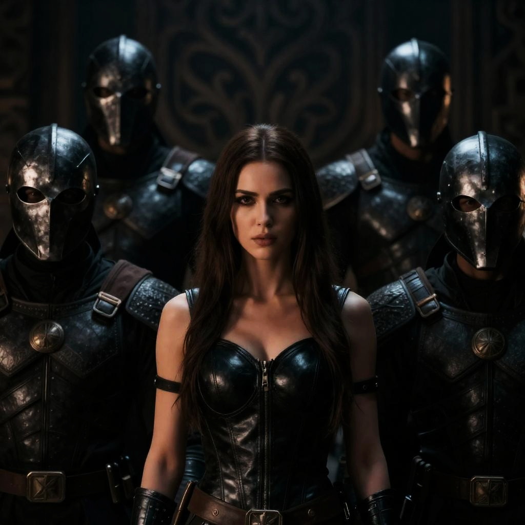 Dark movie still. Central woman with long black hair, intense expression, wearing black leather armor with gold trim, standing between four menacing armored men with skull-like faces, in dimly lit, gothic background. Men have muscular builds, aggressive postures.