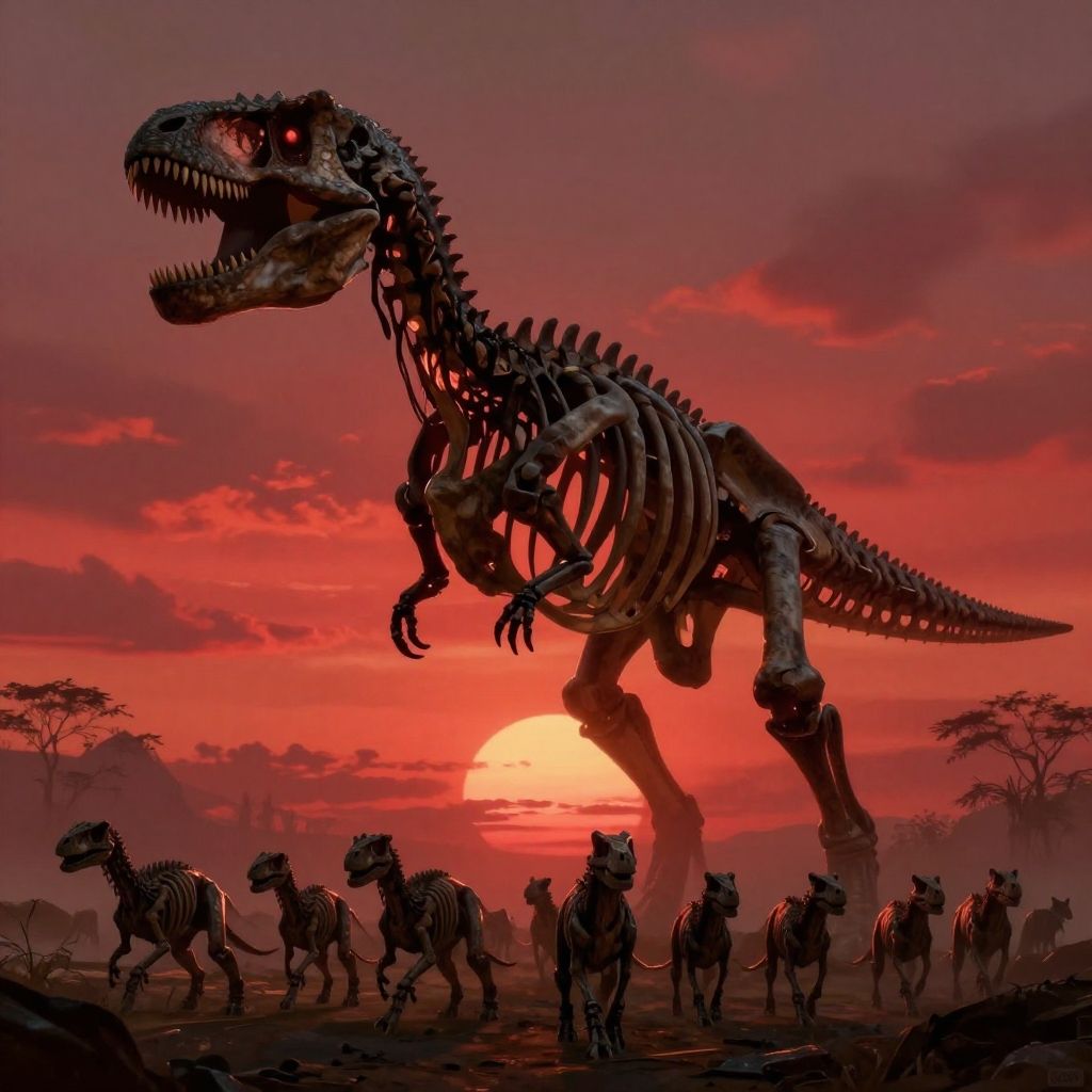 Digital art: A massive, glowing red Tyrannosaurus rex skeleton looms over a herd of silhouetted zebras and antelopes