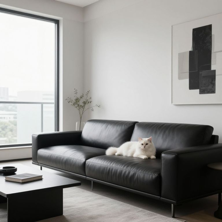 A modern minimalist apartment with large windows, where a fluffy white cat lounges on a sleek leather sofa, surrounded by abstract art and a small coffee table, showcasing the tranquil companionship of pets cats lounging in a contemporary setting