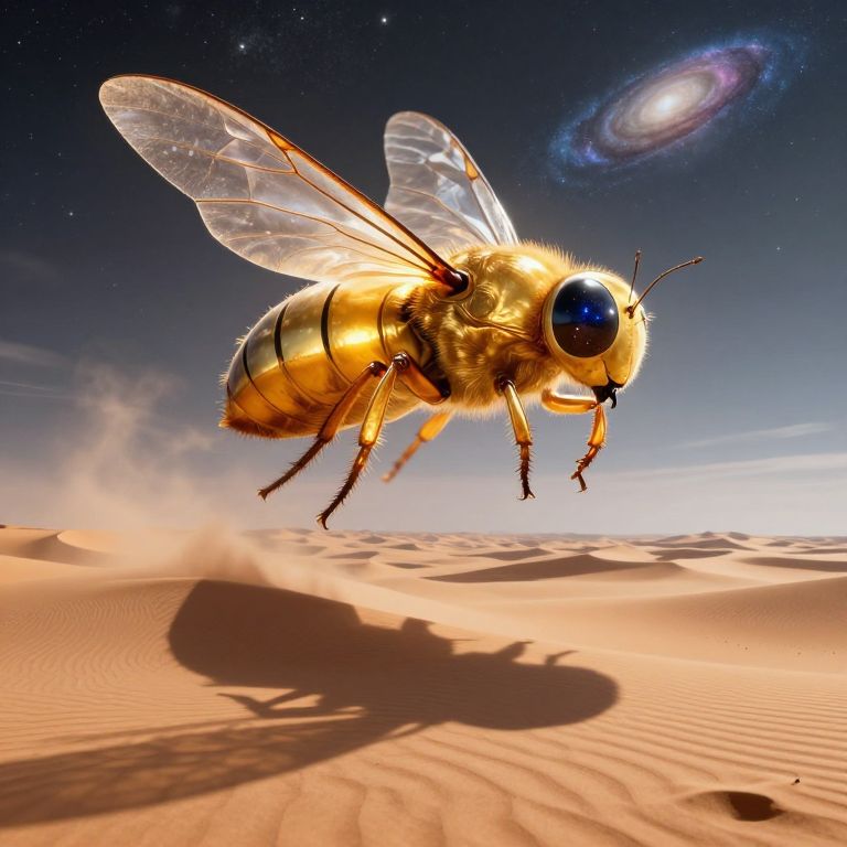 Imagine a surrealistic dreamscape where gravity seems to bend: A colossal golden insect with translucent wings dominates an expansive desert panorama, its luminescent presence casting otherworldly shadows on undulating sand dunes that mimic ocean waves. The creature hovers mid-air, its gaze reflecting celestial vistas of swirling galaxies and nebulae. This striking scene harmoniously blends nature's most delicate creatures with the vastness of outer space, sparking a sense of wonder and curiosity as viewers traverse this ethereal realm where reality intertwines with imagination.