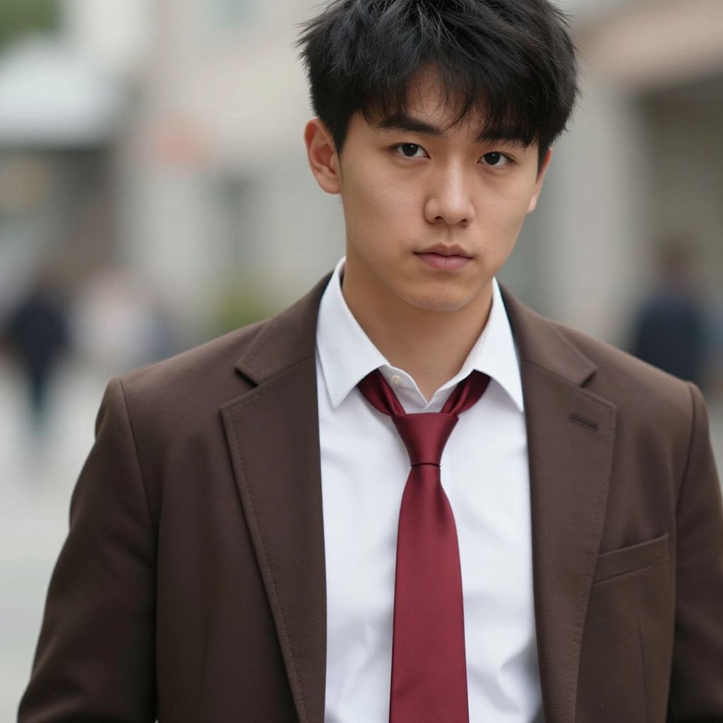 Photograph of an Asian male model with short black hair, wearing a black jacket, black shirt, and bright red pants, walking down a blurred,