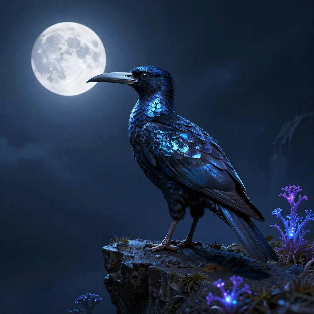 Razor beak sharp and gleaming under moonlight, perched on a jagged cliff edge, mystical atmosphere with glowing bioluminescent plants, ultra detailed feathers with a metallic sheen, surreal fantasy art style, cool blue and purple color palette