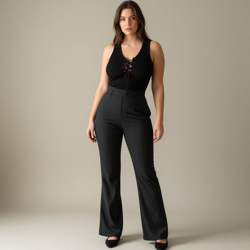 "Woman, contemporary casual, ribbed black sleeveless tank top with front lace-up detail, high-waisted pinstripe trousers in charcoal, relaxed fit, slight flare, slip-on black shoes, neutral indoor background.. Sexy. Pretty face and beаutiful eyes. Big breasts."