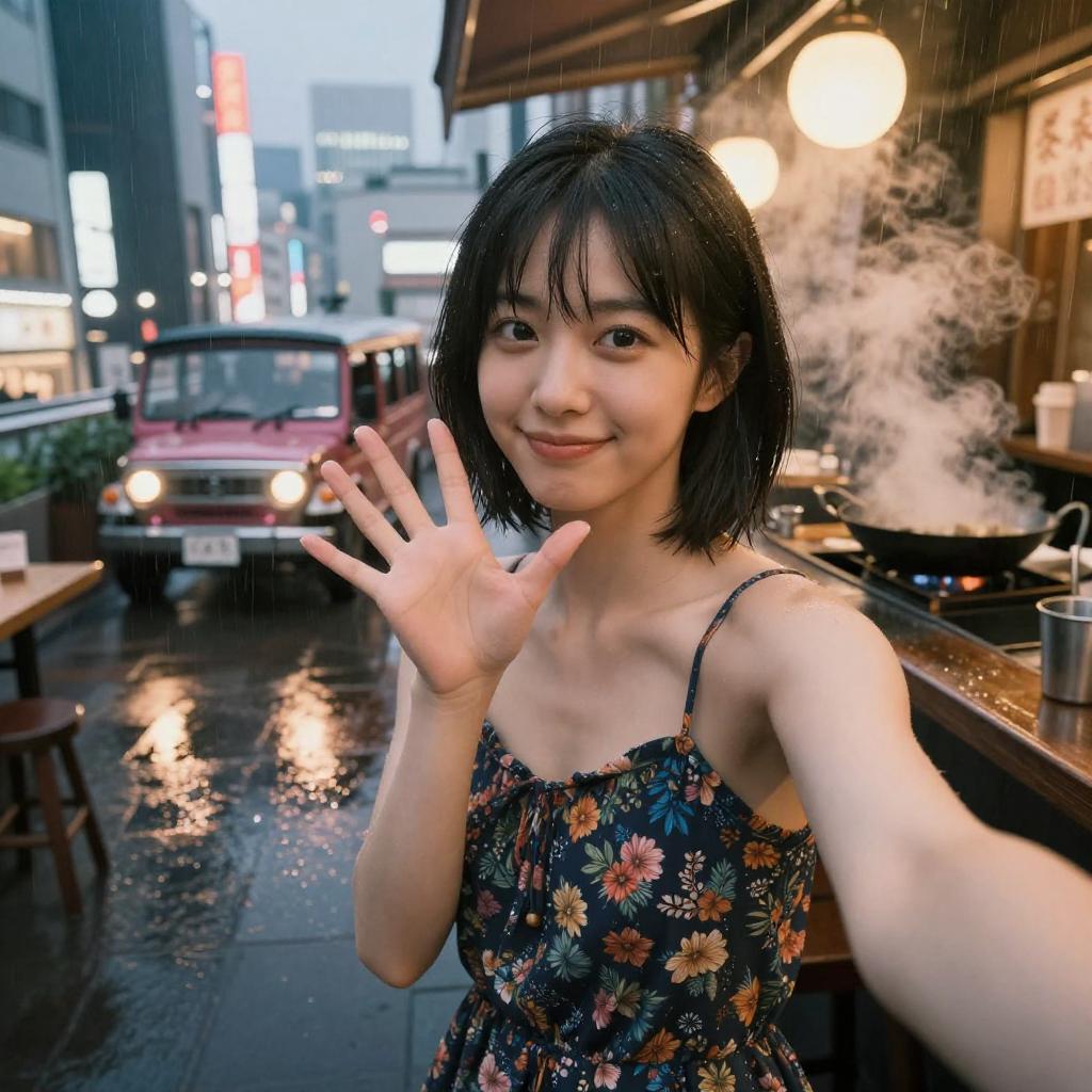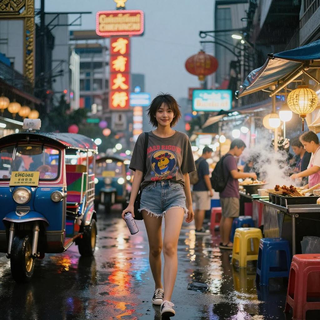 (8k, RAW photo, best quality, masterpiece:1.2), (realistic, photo-realistic:1.37), 2girls, sporty teenagers with black hair, cute:1.2, neon Taipei night market alley with crowded food stalls, paper lanterns and vibrantly colored neon signs, dripping awnings and narrow storefronts, light night rain, glossy wet pavement with strong neon reflections, steam rising from food stalls, soft misty haze, distant bokeh of traffic lights, professional lighting, rim light, photon mapping, radiosity, physically-based rendering, PBR, atmospheric perspective, front-facing, whole body, delicate face, soft smile, looking at viewer, five fingers, natural skin, minimal makeup, DSLR street photography, 35mm lens, shallow depth of field, film grain, high contrast, color graded, candid vibe, selfie pose