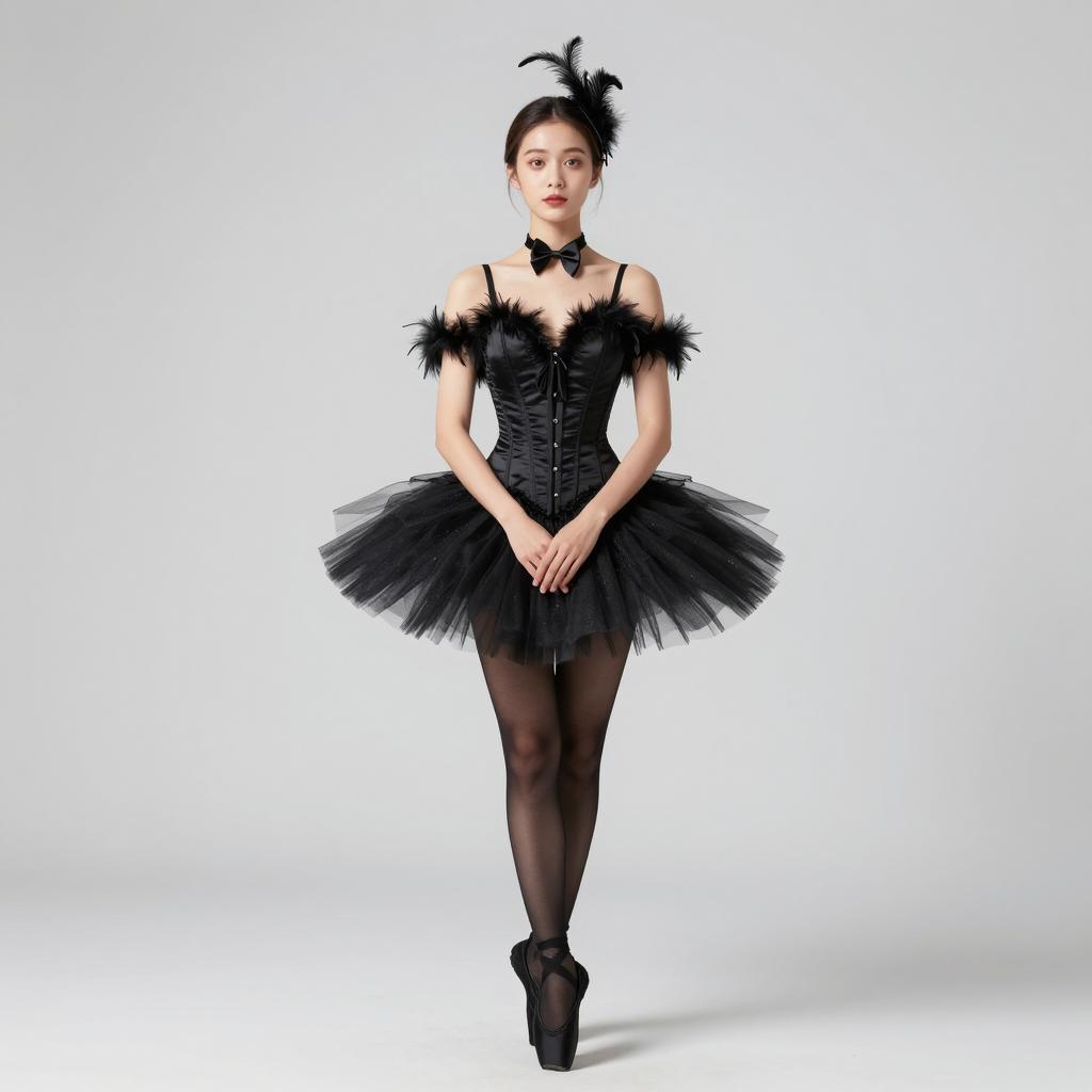 Asian woman with black hair in a high ponytail, wearing a black one-shoulder leotard, black furry arm and leg warmers, seated on red satin fabric. Red satin curtains in background. Her right arm raised, left arm resting on the fabric. Wooden floor in the left corner. Intense expression, looking down. Indoor setting. One person. Photographic image.