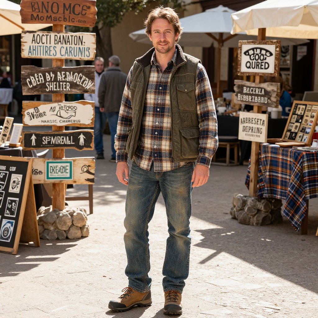 Photograph of a bearded man in a plaid shirt, denim vest, and jeans standing in a sunny outdoor market with wooden signs and plaid