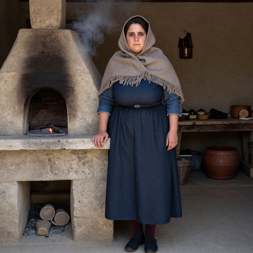 A naturalistic portrait of a peasant woman in a rustic village setting, wearing authentic peasant woman costume from the French countryside, including a dark blue shift, simple stockings, and a woolen shawl draped over her shoulders; she stands beside a stone oven with smoke rising, her face having a serious yet weary expression with dark circles under her eyes.. The woman has big tits and cute face