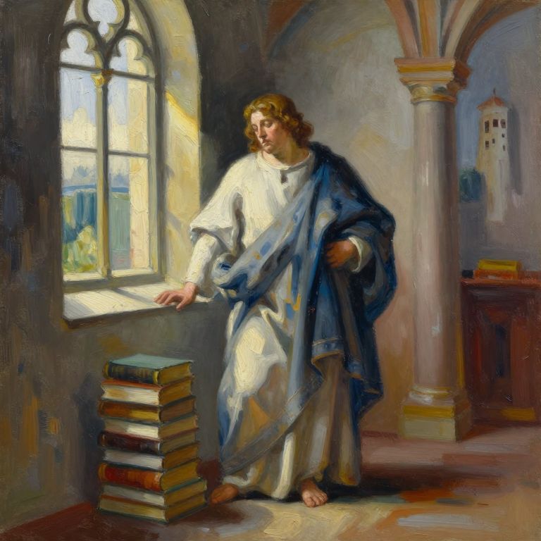This is a digital painting of a young, fair-skinned man with shoulder-length brown hair, dressed in a white robe with a blue cloak draped over his shoulder. He stands barefoot in a sunlit room, next to a large, arched window that casts light on his face and the stacks of books at his feet. The room has stone arches and a distant view of a tower outside. The man's expression is contemplative, with his right hand resting on the window sill and his left hand on his cloak. The colors are warm and soft, with a mix of blues, whites, and earth tones.