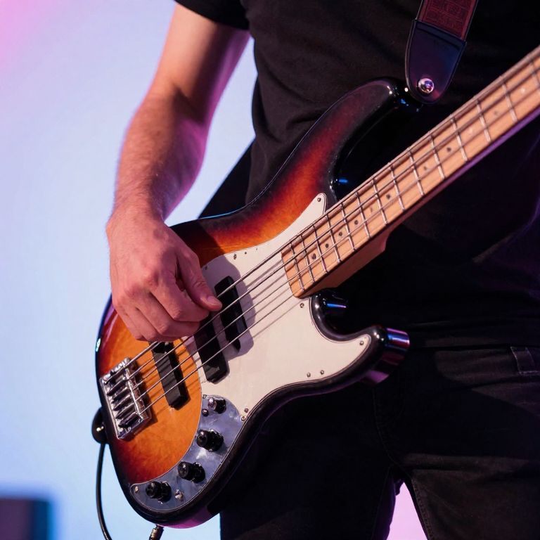 Photograph of a male musician's hands playing a sunburst electric bass guitar, wearing a black shirt, with a blurred blue background.