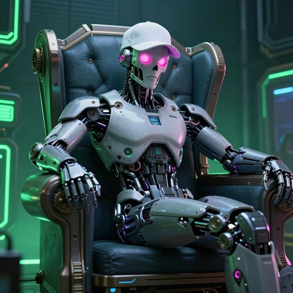 Futuristic cyberpunk android with a muscular design and glowing pink facial features, reclining on a high-tech neon-lit throne. The android is wearing a white baseball cap and displays intricate mechanical details with a skull-like face. The setting includes green neon steampunk elements and a dark, technologically advanced background, emphasizing hyper-realism and cinematic lighting.