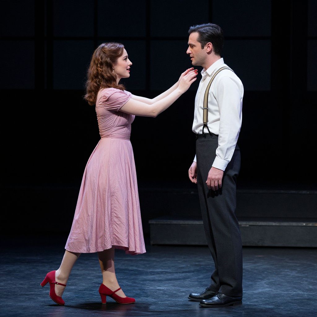 Actors perform a tender scene from *West Side Story* on a dimly lit stage, with a woman in a flowing pink dress and red heels reaching out to a man dressed in a crisp white shirt, suspenders, and dark trousers, both sharing an intimate moment under focused lighting.