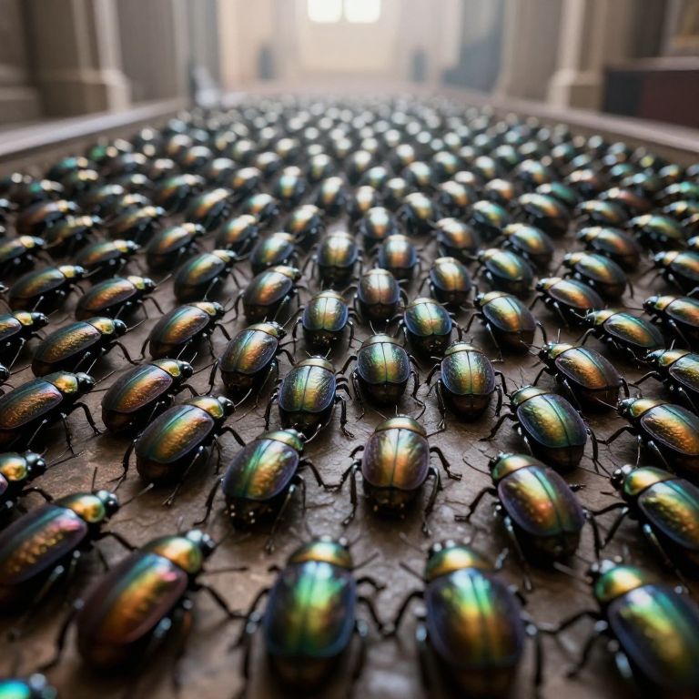 In a cathedral bathed in ethereal light, a sea of iridescent beetles converges, their shimmering forms and synchronized movements evoking a profound sense of unity and collective purpose, while the faint hum of their harmonious chorus resonates like a hymn to the mysteries of existence.