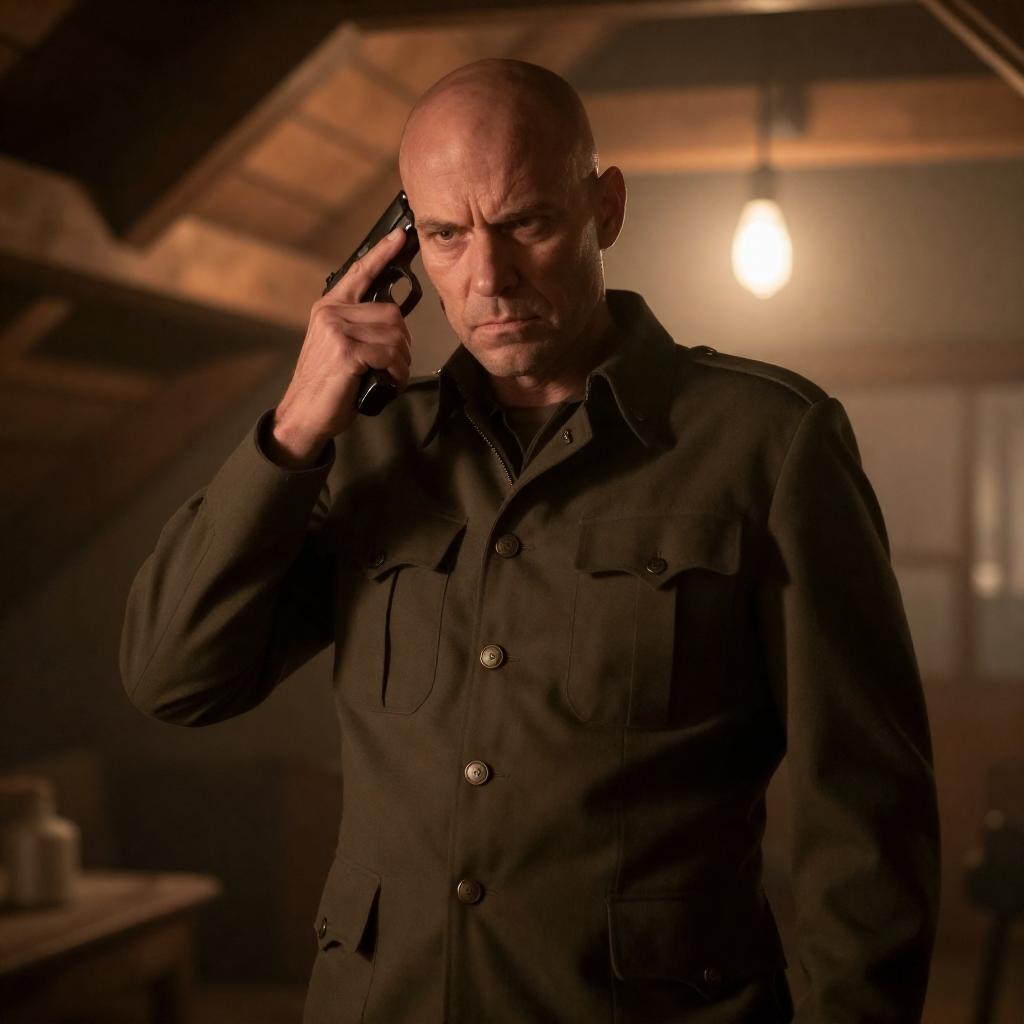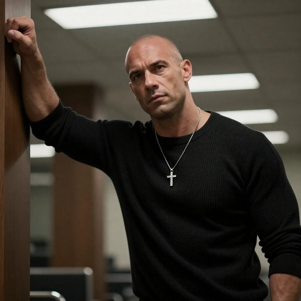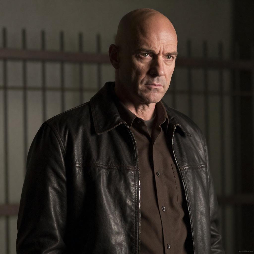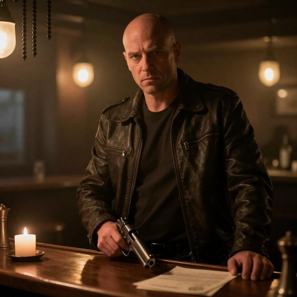 A photograph of a bald, middle-aged man with a serious expression, wearing a dark leather jacket over a brown shirt, standing in a dimly lit, industrial setting with a blurred metal fence in the background. The lighting casts deep shadows, emphasizing his stern face. A small in the bottom right corner reads "MoviestillsDB.com".