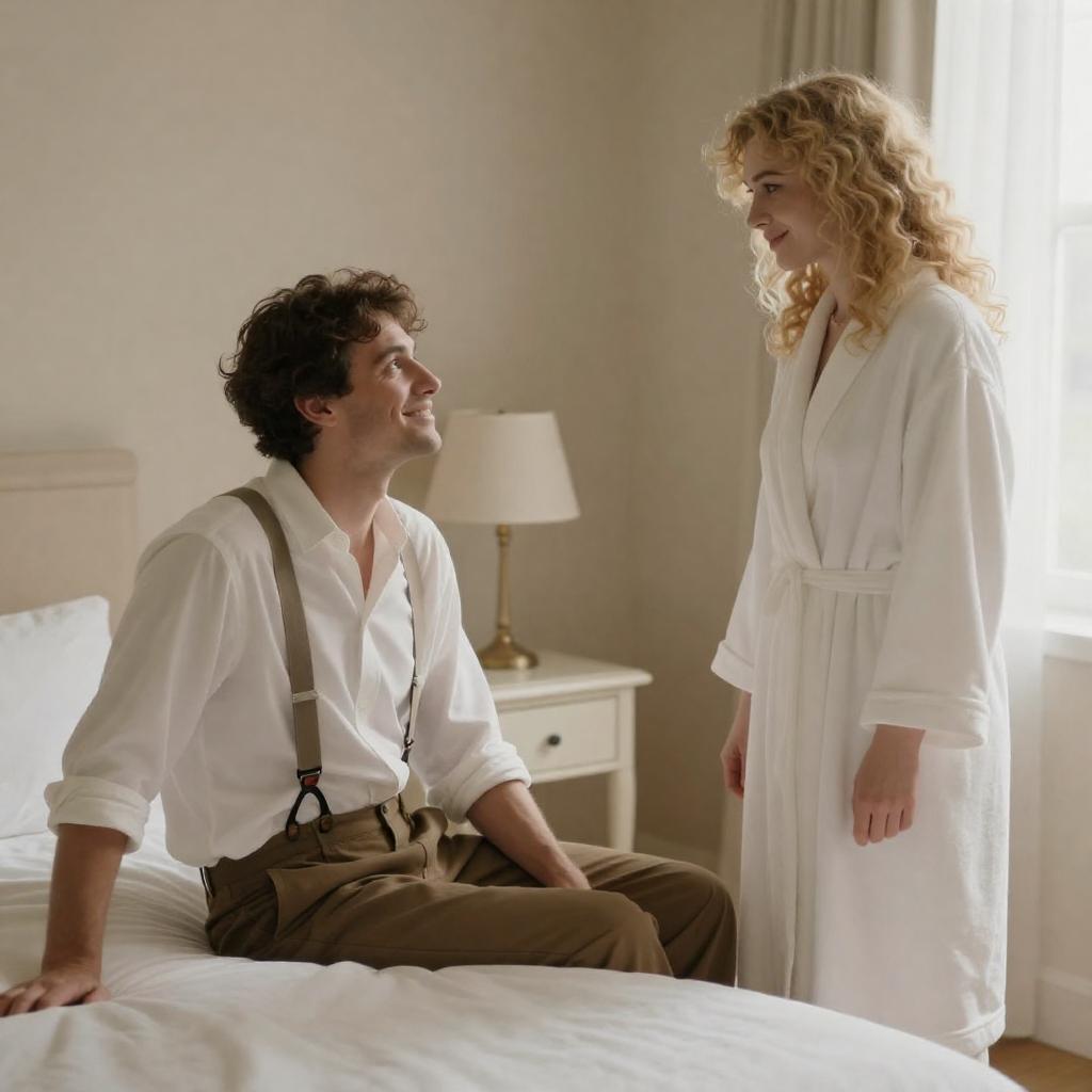 Photograph of a man with dark hair, wearing a white shirt and brown suspenders, sitting on a bed, smiling at a woman with curly blonde hair, wearing a white robe, standing beside the bed. The room has beige walls, a white nightstand with a lamp, and a window with curtains in the background.