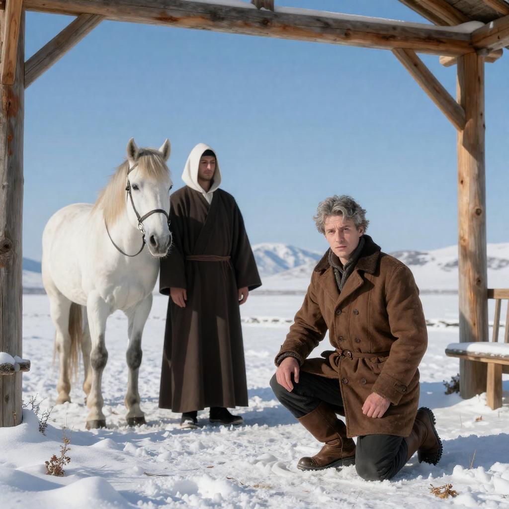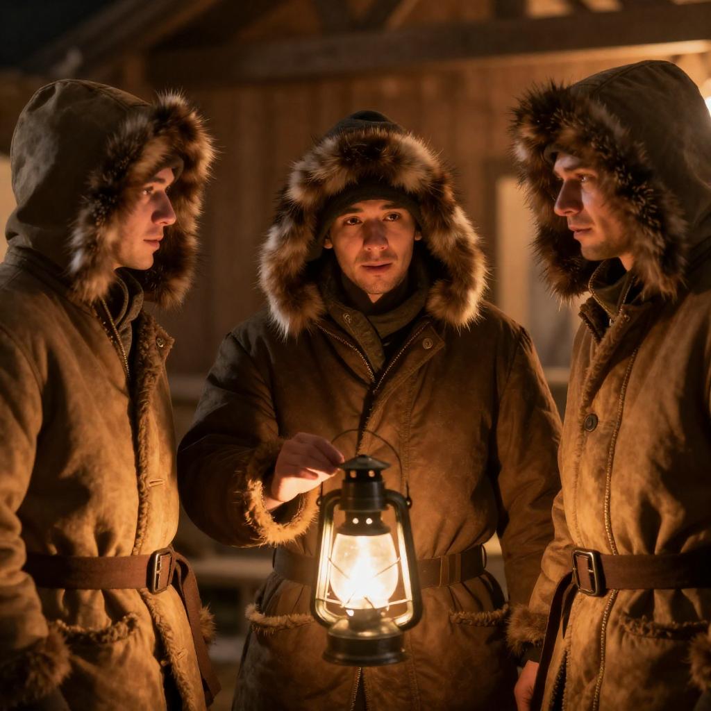 Three men in heavy, fur-trimmed winter clothing with hoods stand indoors, illuminated by a bright lantern held by the central man. The central man gestures with his right hand, while the other two look at him. Warm, orange light. Wooden background.