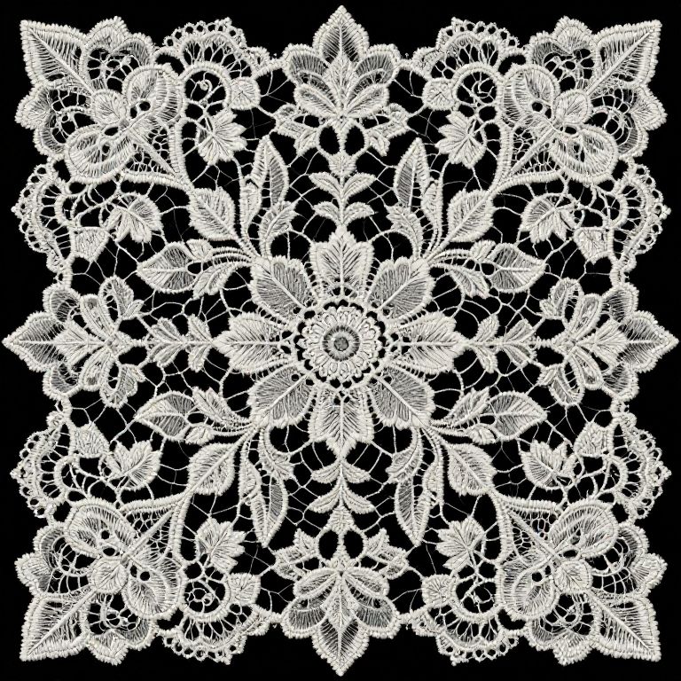 The image showcases a highly detailed, photo-realistic rendering of vintage lace, with intricate floral and leaf patterns that exhibit a sense of depth and texture. The lace design is composed of delicate, interwoven threads that create a sense of movement and fluidity, with swirling vines and elaborate flowers that dominate the composition. The color palette is monochromatic, featuring shades of white and gray against a black background, which accentuates the contrast and highlights the intricate details of the lace. The patterns are arranged in a symmetrical manner, with the central motif being a large, central flower that serves as the focal point, surrounded by smaller flowers and leaves that extend outward in a radial pattern. The overall composition is balanced and harmonious, with the lace elements creating a sense of unity and continuity throughout the image. The high-definition render captures the fine details of the lace, from the individual threads to the subtle variations in texture and shading, resulting in a visually stunning and realistic representation of this traditional textile art form.