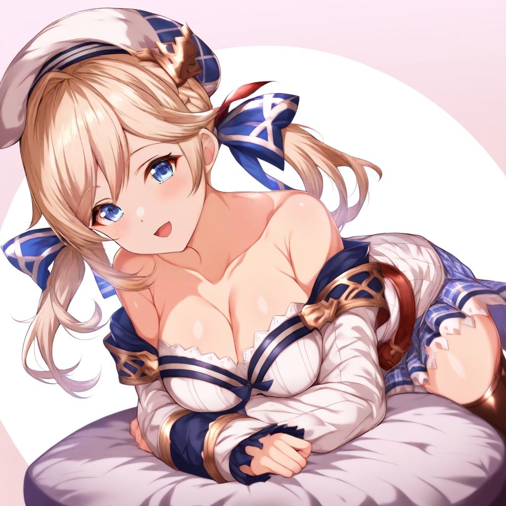 Cucouroux (granblue fantasy), granblue fantasy, 1girl, blue eyes, long hair, blonde hair, twintails, hair ribbon, medium breasts, large breasts, cleavage, collarbone, bare shoulders, long sleeves, beret, by artist kuragari, animagine