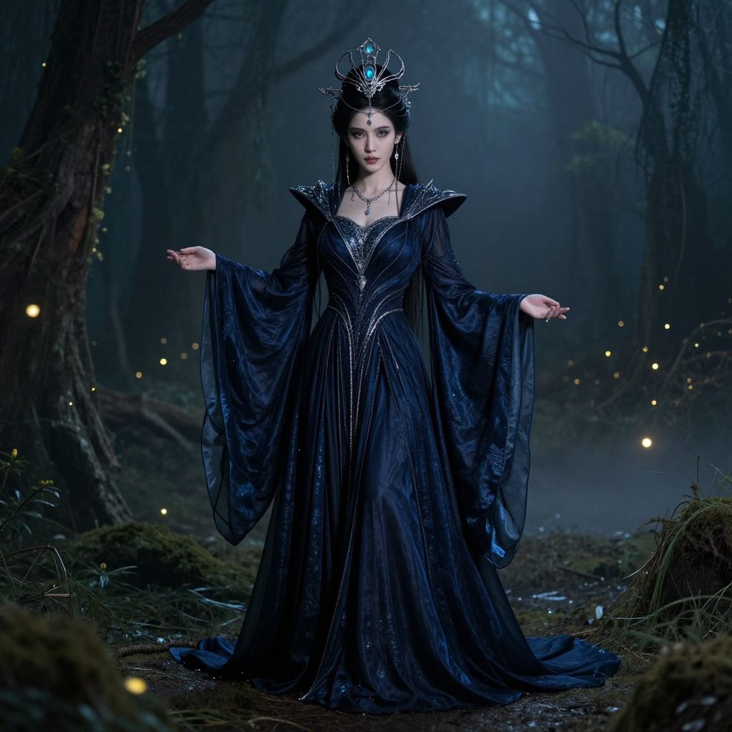 Photograph of a fair-skinned woman with dark, straight hair standing in a mystical forest. She wears an elaborate, dark blue, Gothic-style gown with wide, flowing sleeves and a high, ornate collar. A silver crown adorned with blue gemstones sits on her head. Her arms are raised, palms open. The forest background is dimly lit with blue hues, featuring mist and twinkling fairy lights. Moss and fallen leaves are scattered on the forest floor. The image has a fantasy, ethereal atmosphere with a dramatic, otherworldly feel.