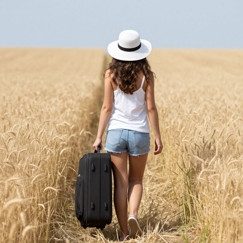 Woman wearing hat with suitcase walking away through wheat field