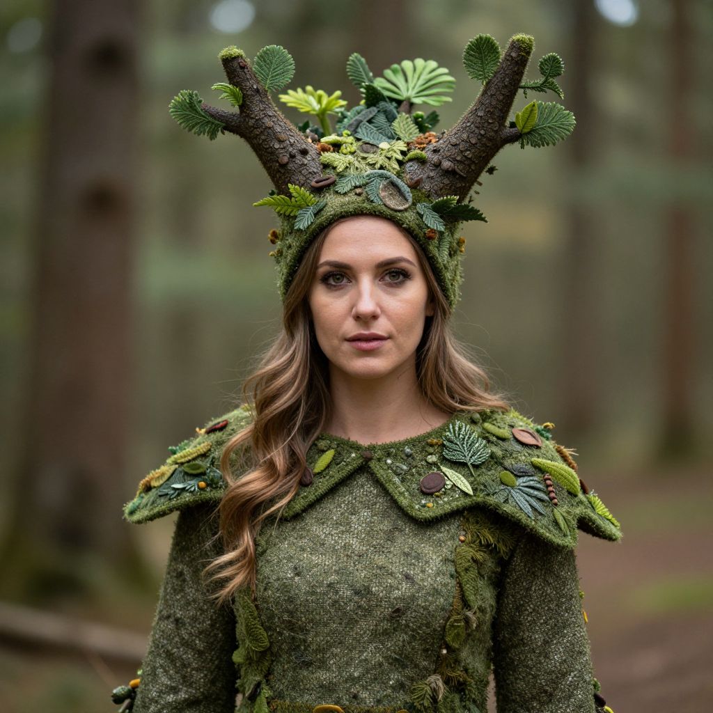 Photograph of a woman with long brown hair, wearing a moss-covered, antlered headpiece and green, leaf-adorned dress, standing