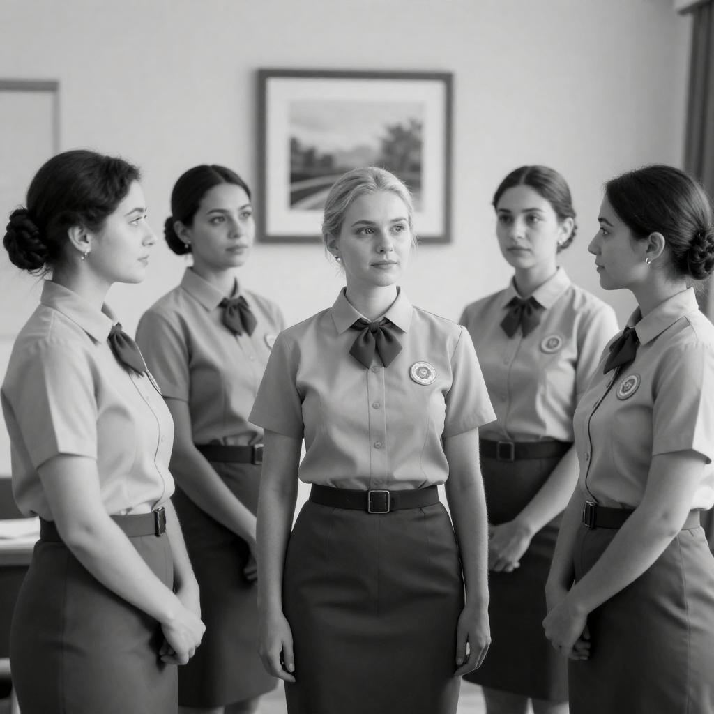 Photograph of two women in vintage baseball uniforms, blue caps, and belted dresses. One woman holds a bat, standing in front of the other who smiles. Both have light brown hair, one in a side braid, the other in waves. They stand in a wooden baseball dugout with a grassy field and spectators in the background. A man in a blue shirt stands to the right. The woman holding the bat has "Just Darn Good" on her back. Sunlight illuminates the scene.
