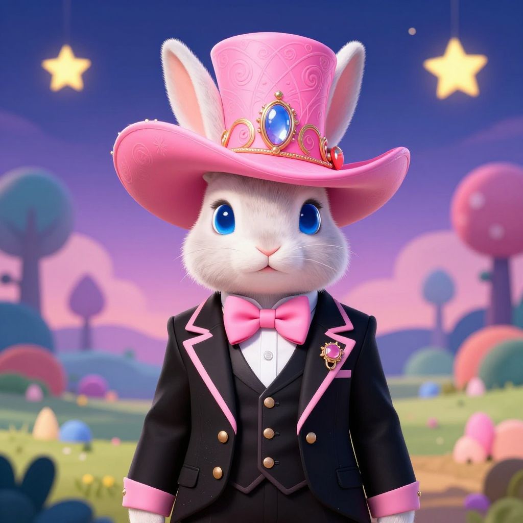 Digital illustration of an anthropomorphic white rabbit with large, bright blue eyes, standing in a whimsical, colorful landscape at twilight. The rabbit wears a pink top hat adorned with a gold and blue gem, and a black tuxedo with pink trim, bow tie, and a red flower lapel pin. The background features a purple to pink gradient sky with stars, round pink and green trees, and floating pastel-colored mushrooms. The rabbit's fur is smooth and fluffy, contrasting with the formal attire. The overall style is vibrant and cartoonish, with a playful, fairy-tale-like atmosphere.
