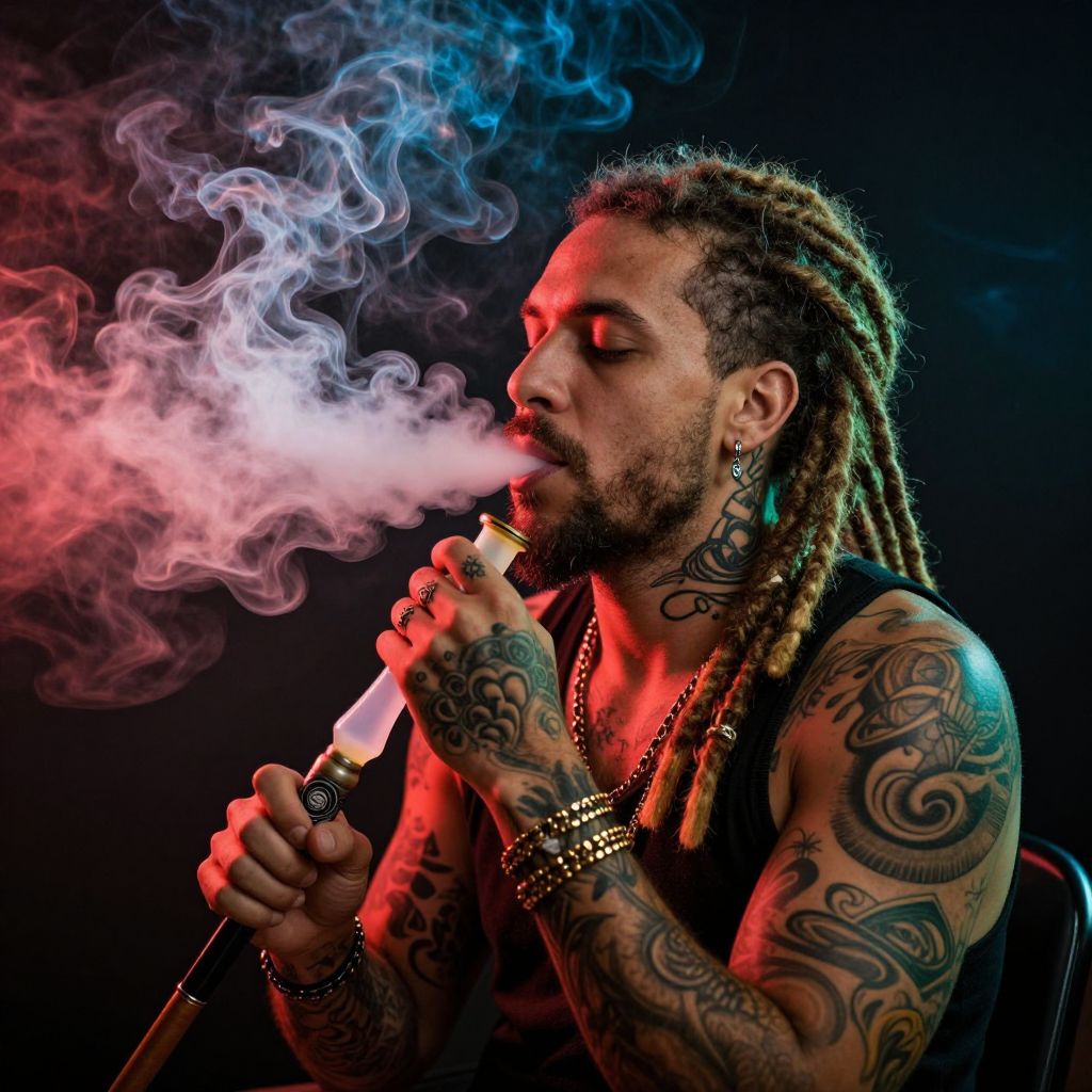 Photograph of a muscular, tattooed man with light brown skin and long, braided hair. He is smoking a hookah, with vivid blue and red smoke swirling around his head. He wears a black tank top, silver bracelets, and a necklace with a large black ring. His tattoos include intricate designs on his arms and chest. The background is dark, highlighting the colorful smoke and his detailed tattoos. His eyes are closed, and he has a focused expression. The lighting creates a dramatic, intense atmosphere.