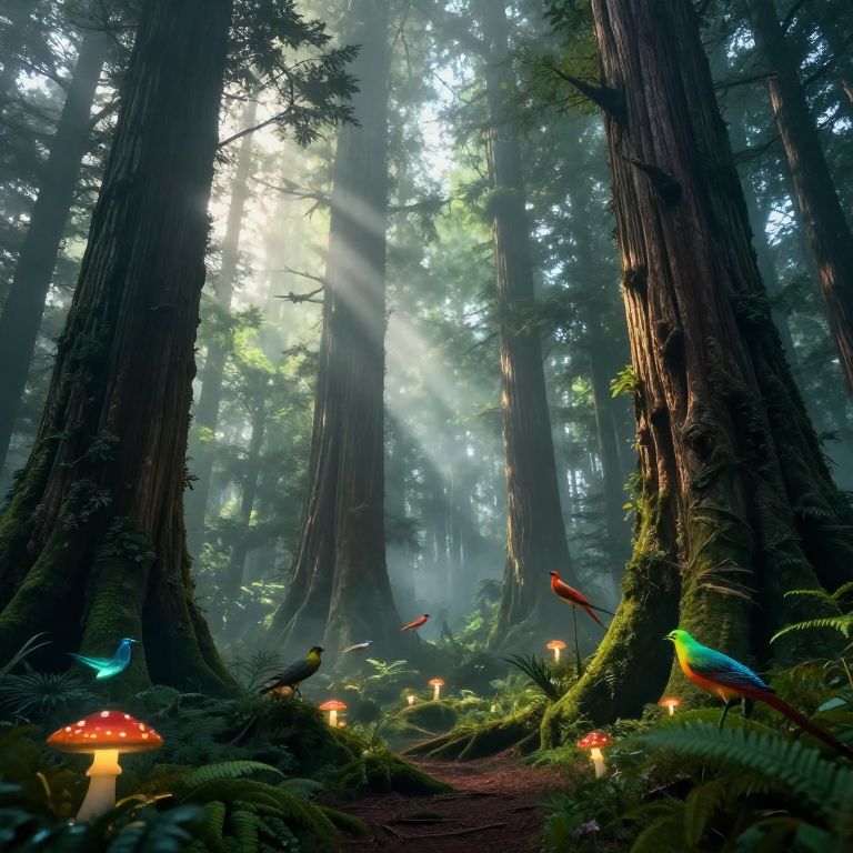 Enchanting forest photograph: Tall redwoods, sunlight beams, colorful birds, glowing mushrooms, lush greenery, misty atmosphere, magical woodland scene