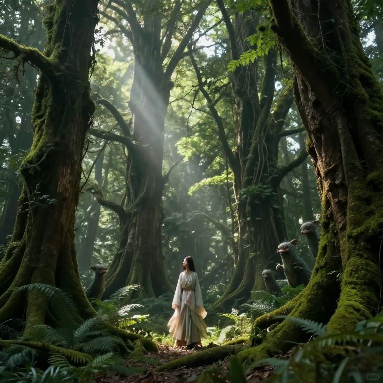 Marini exploring an enchanted ancient forest, with ethereal light filtering through towering trees covered in moss, mystical creatures peeking from behind the foliage, dressed in flowing robes that blend with the natural surroundings.
