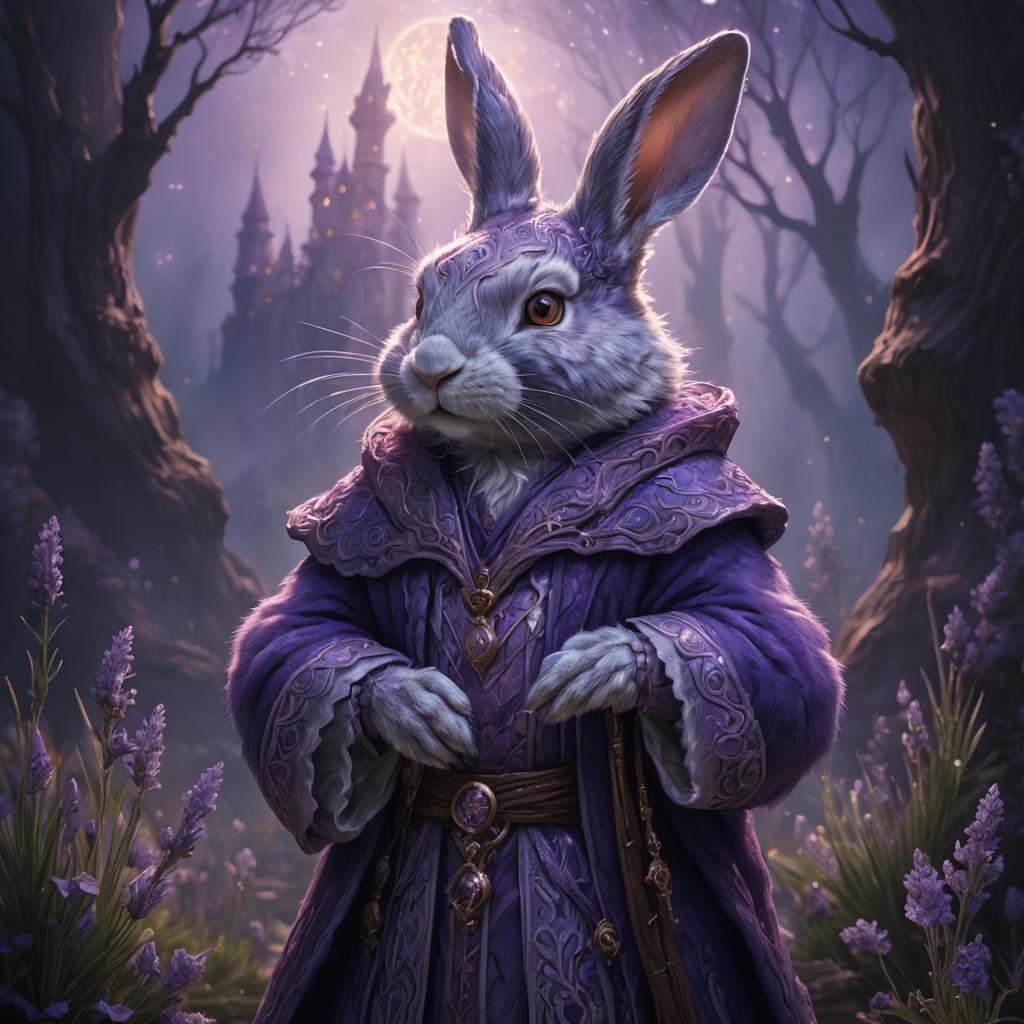 A otherworldly rabbit mage with lavender fur stands poised in a mystical environment, illuminated by soft, diffuse lighting. This artwork showcases intricate details and is rendered in a lifelike digital painting style, inspired by renowned artists.