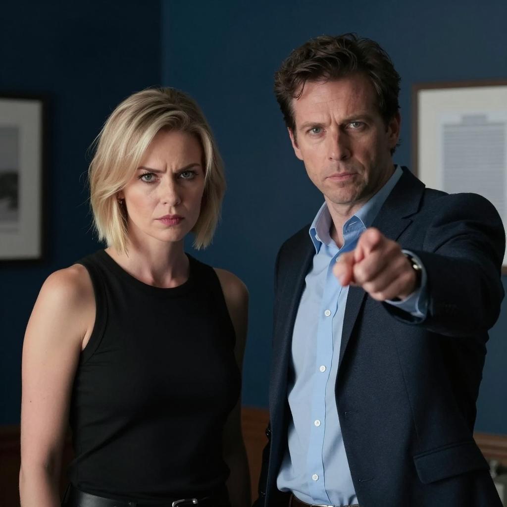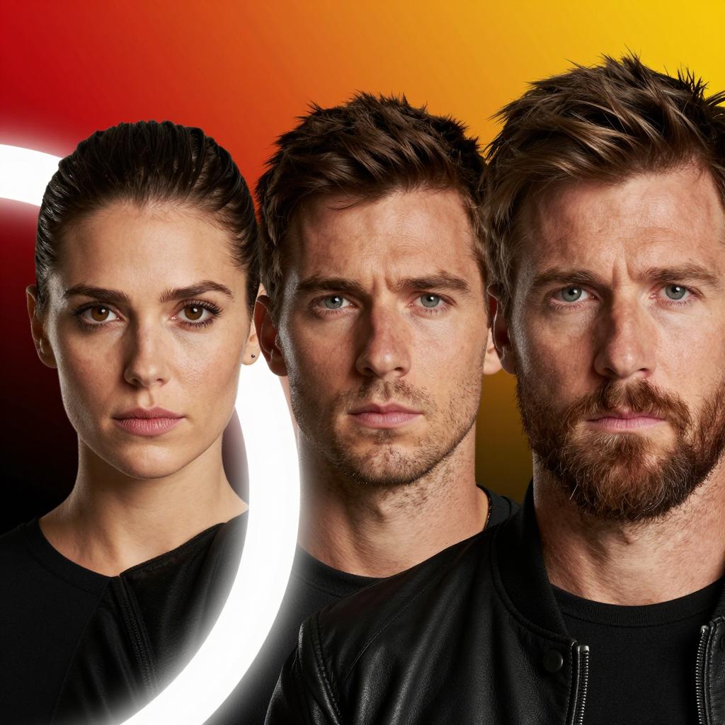 Three people. Foreground: man with brown hair, white shirt, blue denim jacket with tan collar, serious expression, right side. Middle ground: woman with short dark hair, white top, intense gaze, centered. Background: man with gray hair, black jacket, slight smile, left side. Purple and red gradient background.