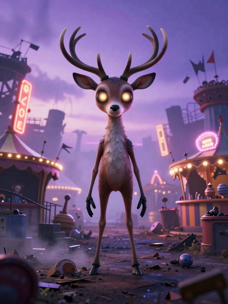Spooky stylized goat character standing upright in the center of a ruined carnival, huge glowing eyes staring at the viewer, long skinny limbs, surrounded by half-sunken bumper cars and twisted rails with broken attractions and debris, drifting ash filling the air, cinematic wide-angle shot, dark whimsical fantasy style, highly detailed 3d illustration, soft volumetric eerie blue light light, high resolution