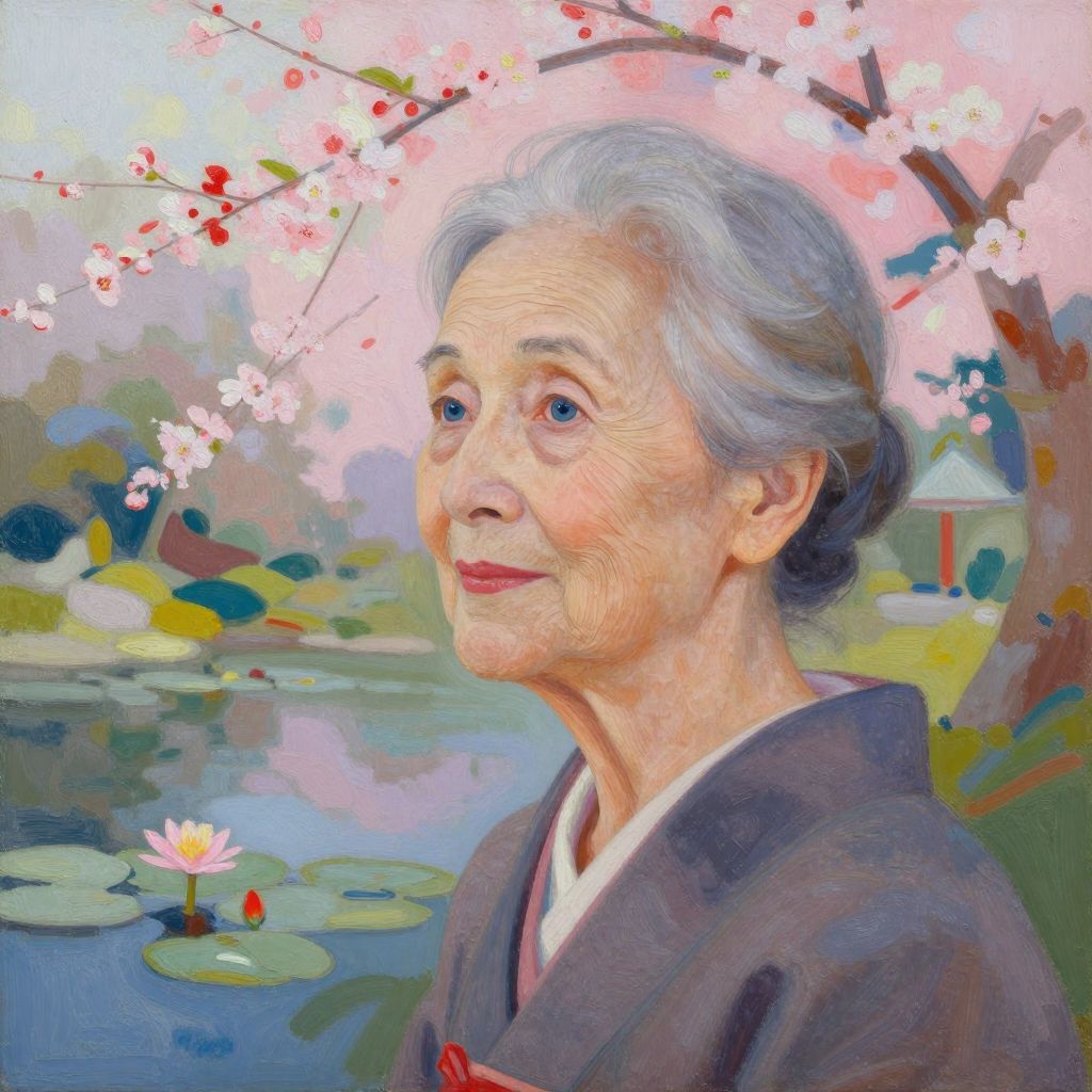 This is a digital painting of an elderly Asian woman with fair skin and grey hair, styled in a simple updo. She has delicate features, blue eyes, and a gentle smile. She wears a dark grey kimono with a white collar and a red brooch. The background features a serene pond with lily pads and a single pink lotus flower, surrounded by colorful, blooming cherry blossoms. The sky is a soft pink and blue gradient. The style is impressionistic with vibrant colors and soft textures, capturing a peaceful, springtime garden scene.