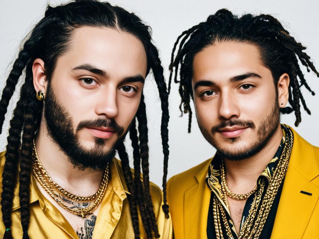 Photograph of two identical men with long black dreadlocks, beards, gold chains, and yellow shirts, against a plain white background.