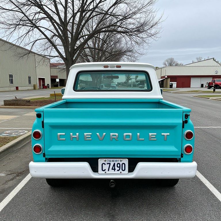 Vividly painted turquoise 1954 Chevrolet 3100 pickup truck showcased outdoors, featuring a classic design with prominent \"CHEVROLET\" lettering on the tailgate and license plate reading \"C7490,\" positioned centrally in a spacious parking lot surrounded by bare trees and industrial buildings.