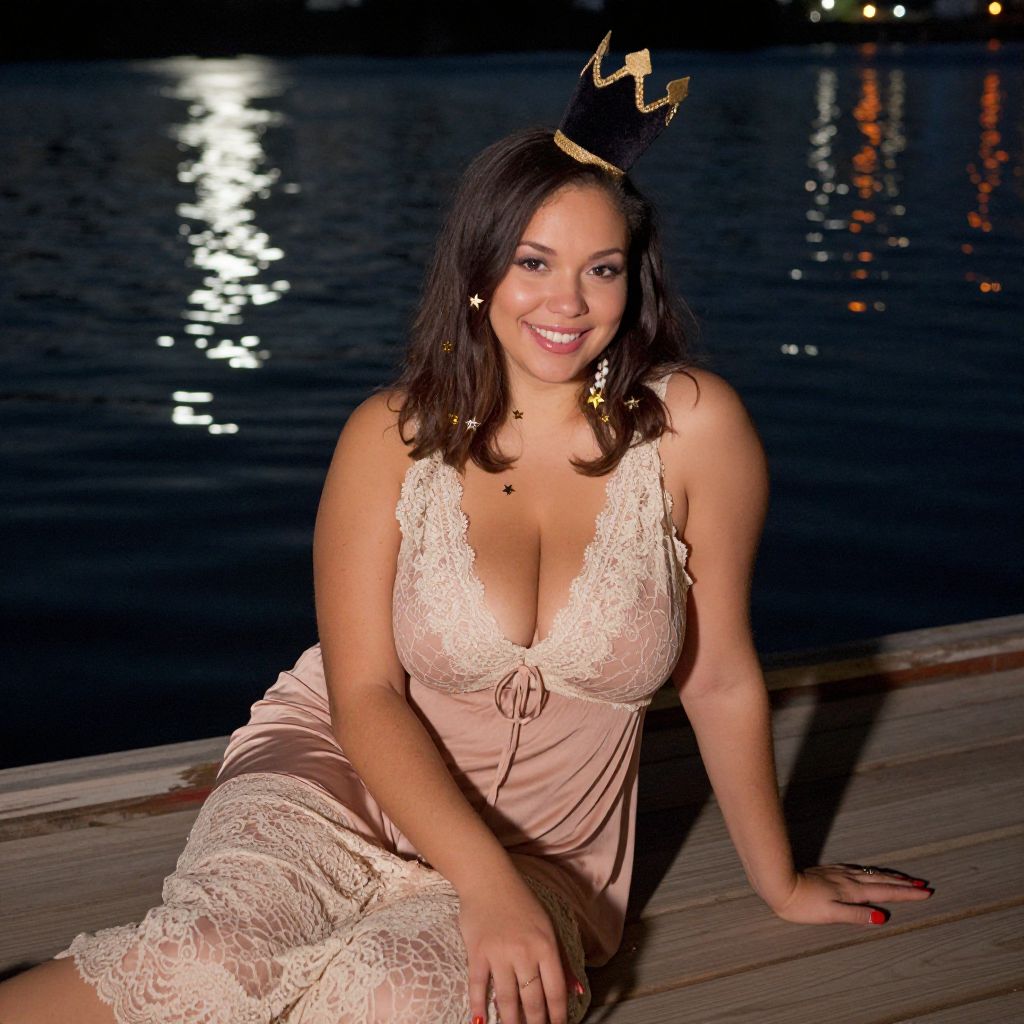 A friendly plus-size woman in her 30s with soft caramel skin, a radiant grin, and long shoulder-length hair sits on a wooden dock at a riverside night, dressed in a luxurious night dress with a lace overlay, paired with a whimsical costume element—a small velvet crown and star-shaped accessories—set against a serene, moonlit water surface and twinkling reflections.. The woman has big tits and cute face