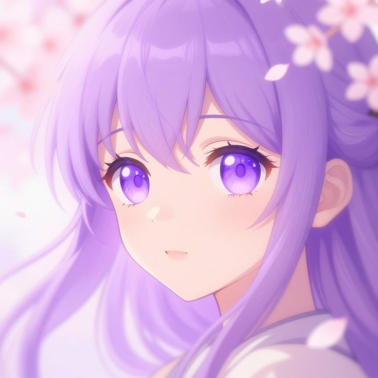 Close-up of violet eyes anime girl with long flowing lavender hair, gentle expression, cherry blossom petals floating around, soft pastel background, intricate shading and highlights capturing the eyes’ mesmerizing glow, digital art with dreamy atmosphere