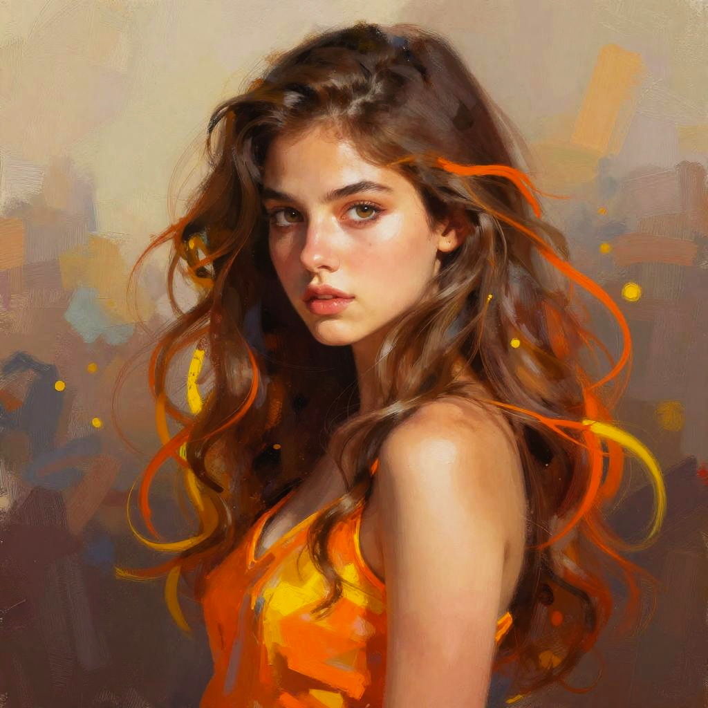Digital painting of a young woman with long, wavy brown hair with orange highlights, wearing an orange top, against a blurred, colorful background. She
