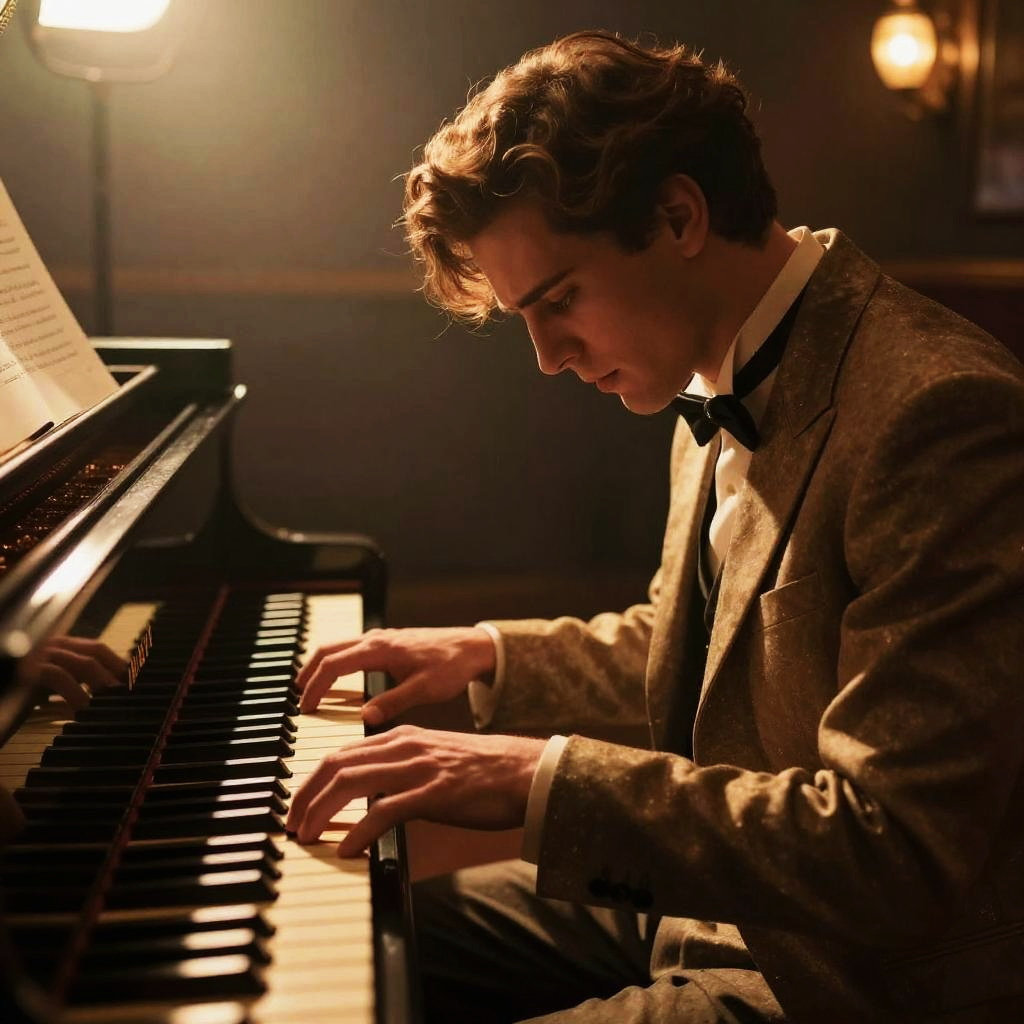 Dread head character playing a grand piano in vintage jazz club, smoky ambiance, warm golden lighting, elegant clothing with retro style, emotional expression, rich texture details