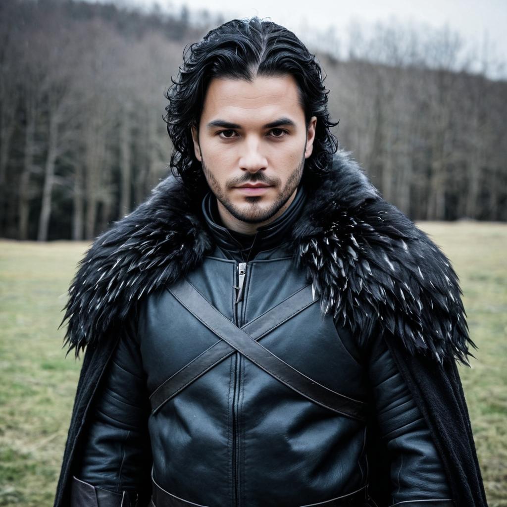 Jon snow cosplay costume ,solo, black hair, 1boy, outdoors, male focus, facial hair, looking at viewer, standing, closed mouth, black eyes