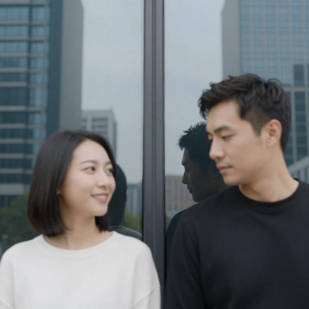 Photograph of a man and woman outdoors. Man in black suit, white shirt, red tie, holding a camera, serious expression. Woman with short black hair, black coat, smiling, standing beside him. Red microphone on ground near woman. Bare trees and bushes in background. Man's right hand raised, holding camera. Both facing each other.
