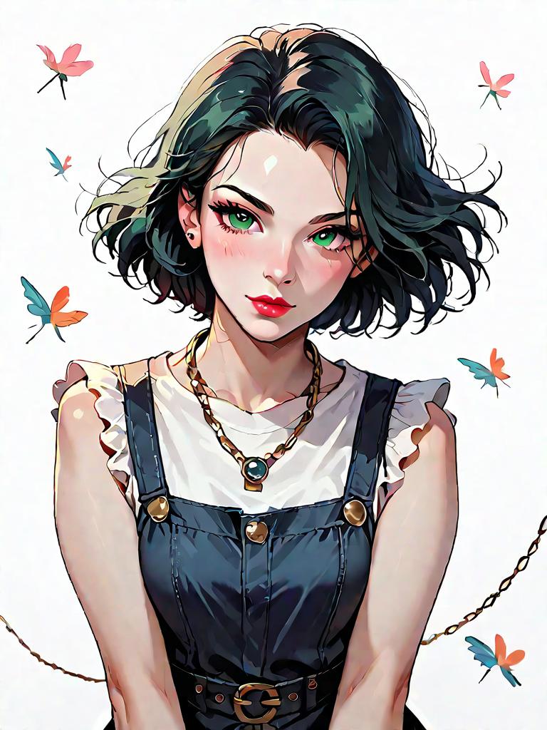1girl, source_comics, realistic face, full body shot, Woman, retro-inspired, black pinafore dress with small floral print in shades of pink and green, square neckline, sleeveless, over a black long sleeve crewneck top, mini-length, small chain necklace, plain white backdrop.