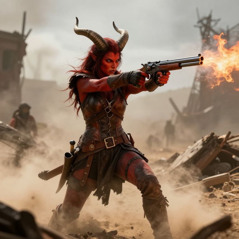 Female tiefling gunslinger in a dark fantasy desert setting, wearing leather armor with intricate demon horn details, wielding dual pistols with glowing runes, intense gaze, fiery background, detailed textures, cinematic lighting, dynamic pose.