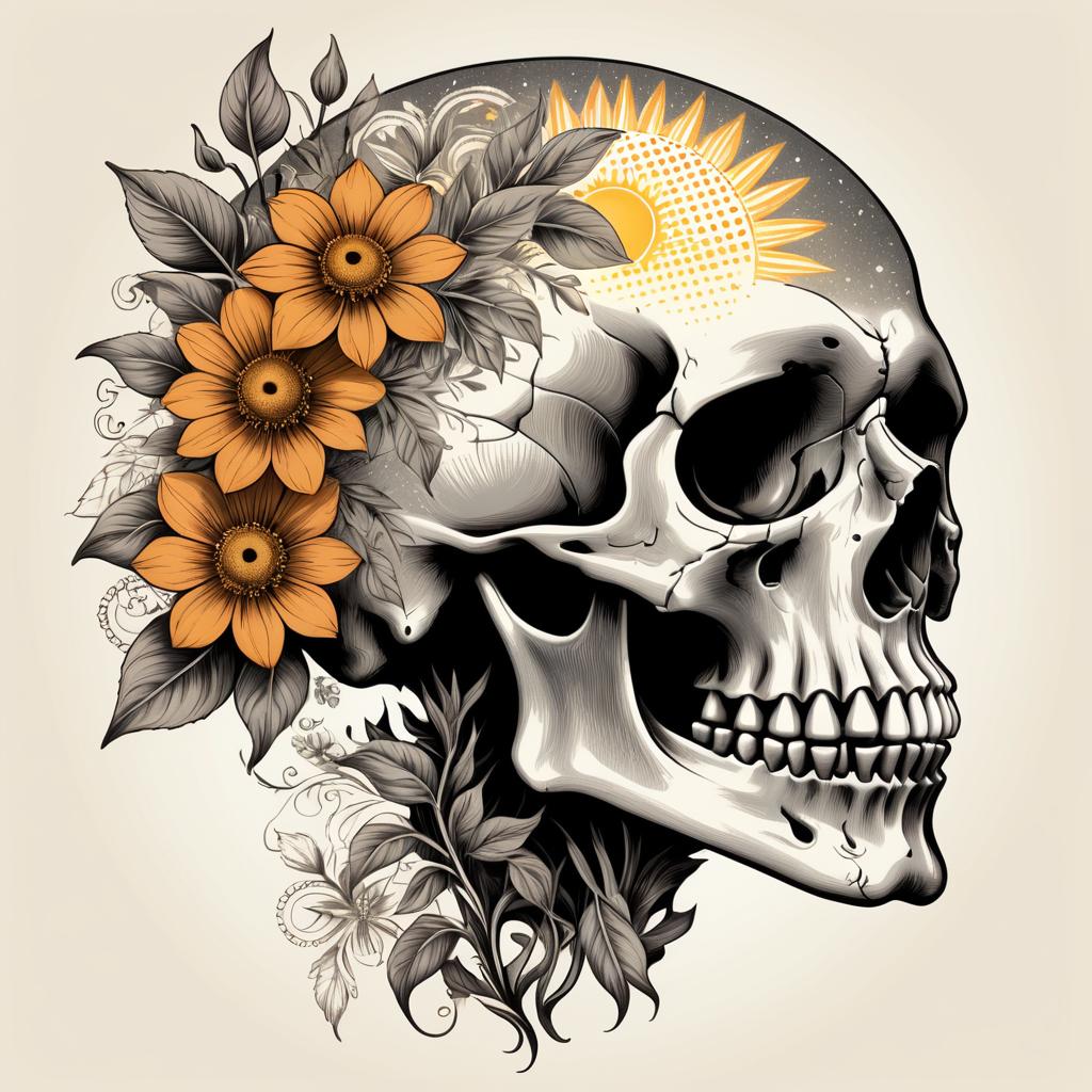 Detailed retro vintage illustration of a human skull in profile view featuring intricate halftone shading. The skull is surrounded by blooming orange and yellow flowers with green leaves, set against a warm muted orange background. A radiant sun with detailed rays emanates behind the skull, rendered in a vintage engraving style. High detail floral elements enhance the artistic composition.