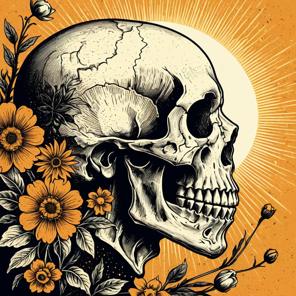A detailed retro vintage illustration of a human skull in profile view with intricate halftone shading, surrounded by blooming flowers and a radiant sun in the background, warm muted orange and yellow color scheme, vintage engraving style, floral elements, high detail