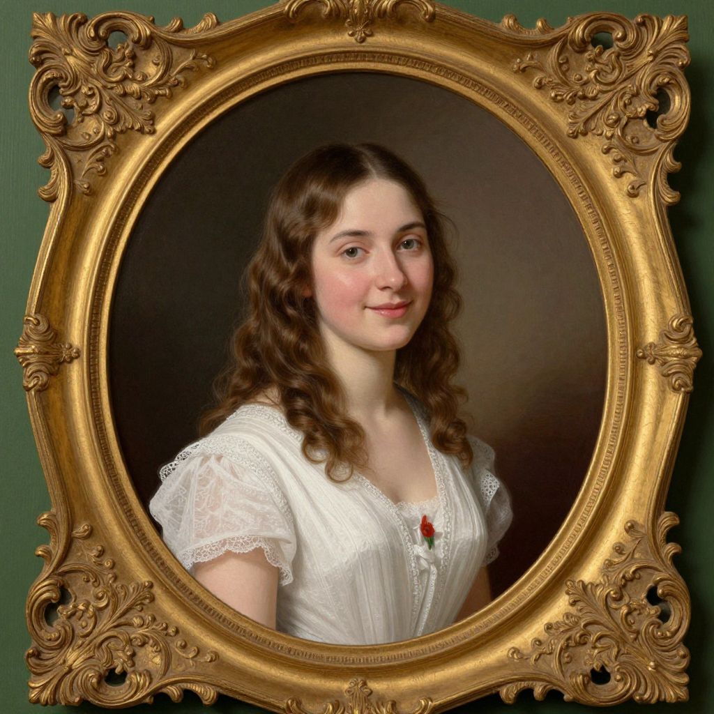 Photograph of a young woman with fair skin and long, wavy brown hair, wearing a white lace-trimmed blouse with short sleeves. She has a gentle smile and is adorned with a red brooch at her collar. The subject is framed in an ornate, oval-shaped, gold-painted wooden frame with intricate floral carvings on the corners. The background is dark, highlighting the subject's face and upper torso. The frame's green backing contrasts with the gold and dark background, adding depth to the portrait. The overall style is classic and elegant.