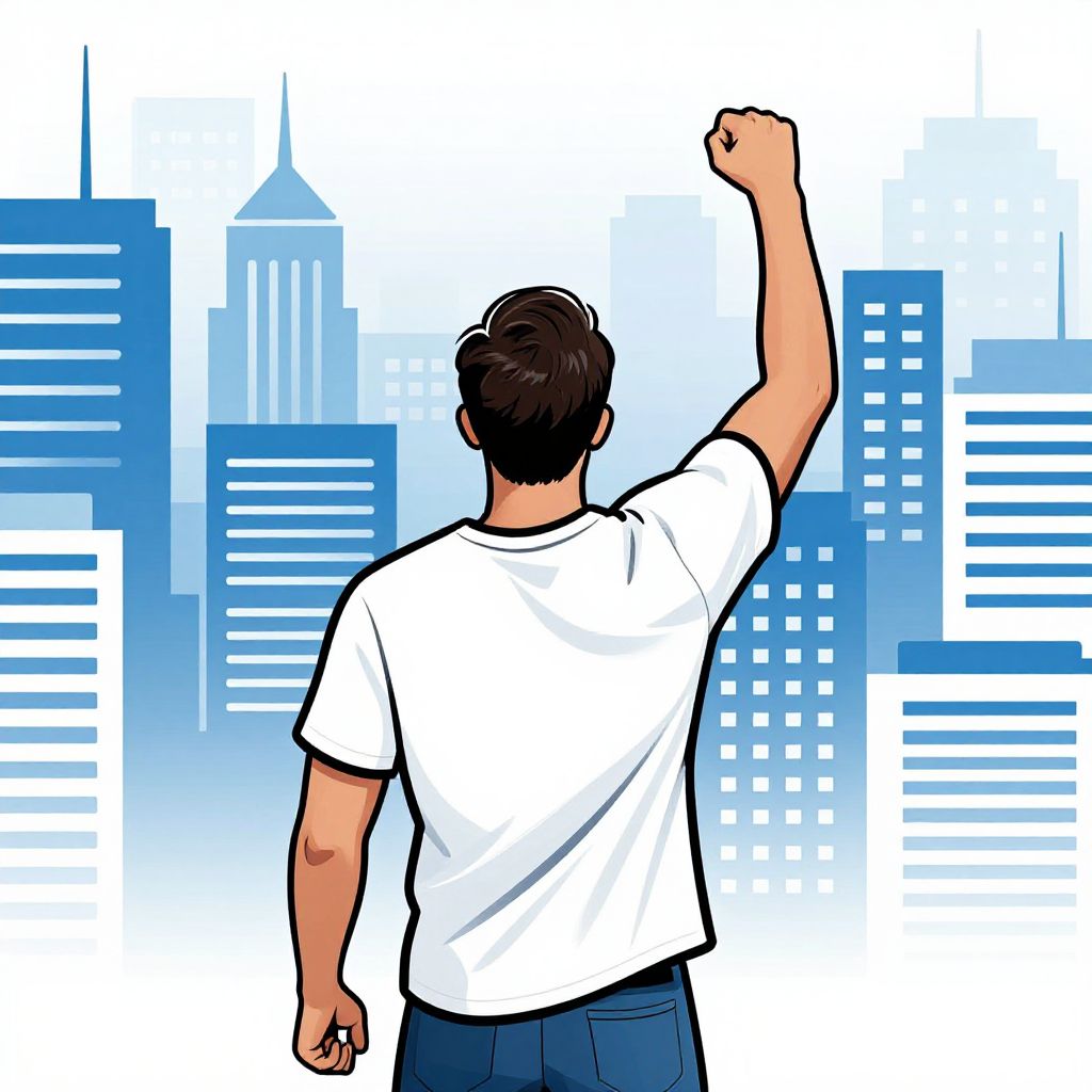 A digital illustration depicting a man from the back, standing against a stylized cityscape. The man, with short dark hair, wears a plain white t-shirt and dark blue jeans. He raises his right arm in a triumphant fist pump. The background features blue and white skyscrapers with varying heights and window patterns, creating a modern urban setting. The man's skin tone is light, and his physique is average. The overall style is clean and bold, with strong contrasts and a slightly cartoonish aesthetic.