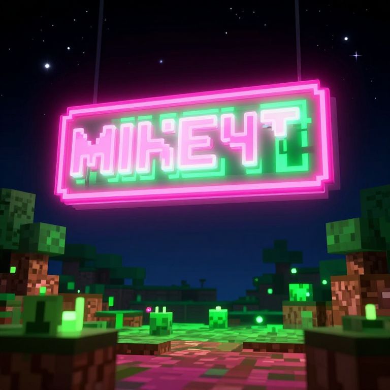 Minecraft neon sign floating above pixelated landscape, radiant neon pink and green colors shining against a starry night sky, enhanced blocky terrain with glowing accents, surreal and futuristic visual, blending classic Minecraft aesthetics with neon cyberpunk style.