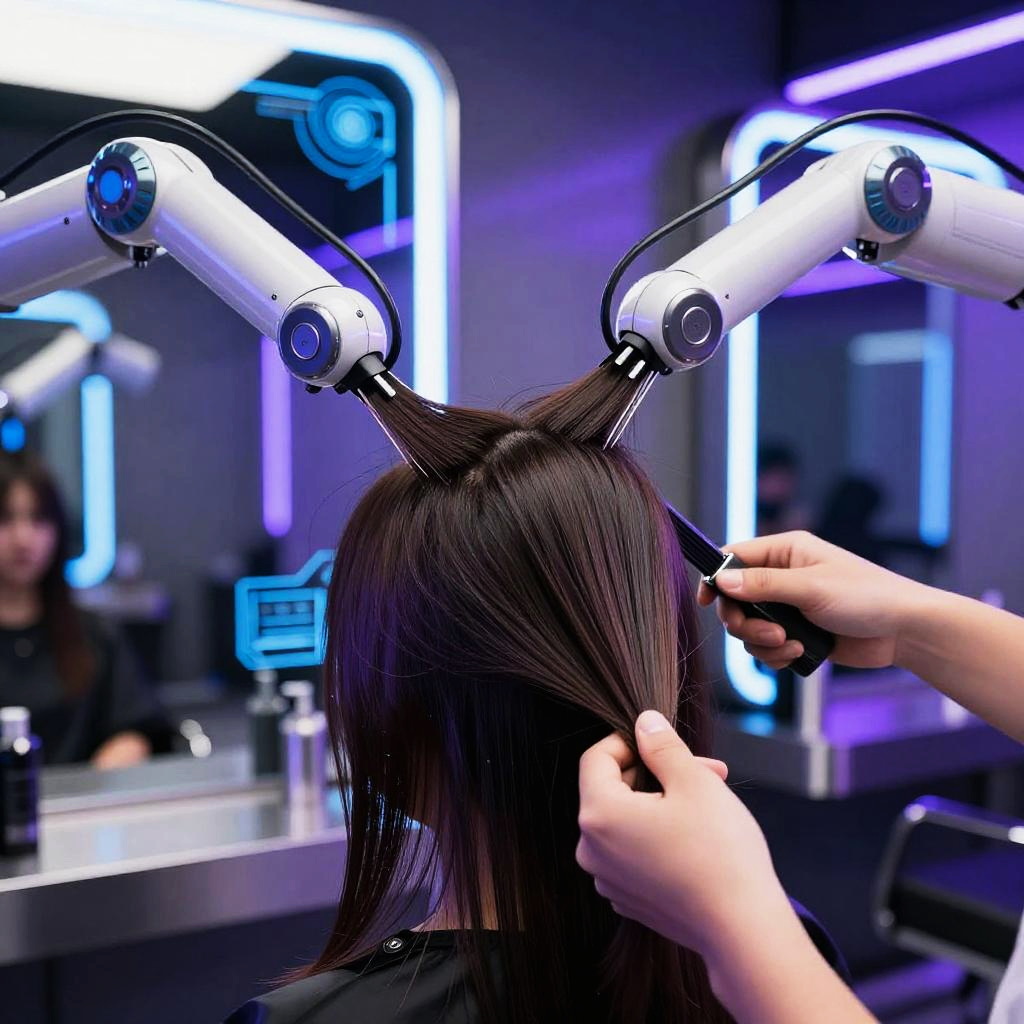 AI haircut futuristic salon scene with advanced robotic arms precisely styling hair, neon blue and purple lighting, sleek mirrors reflecting intricate digital patterns, cyberpunk atmosphere, ultra-detailed close up of hair strands blending human and machine aesthetics